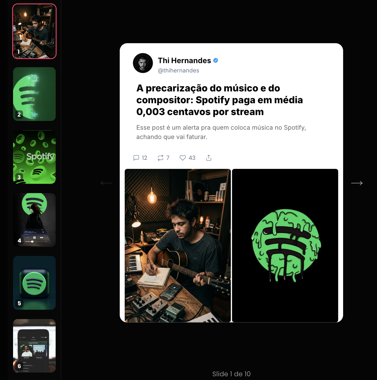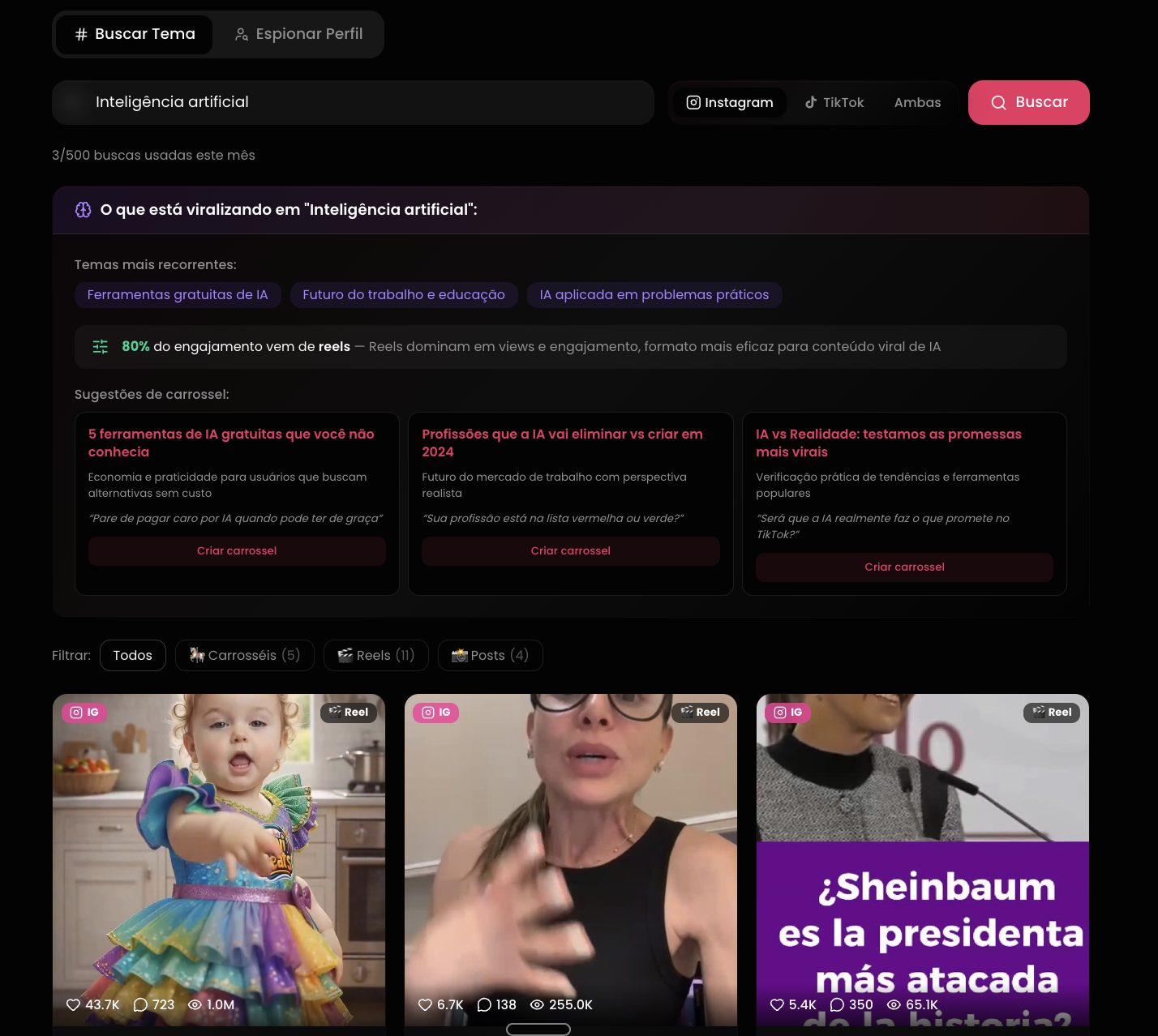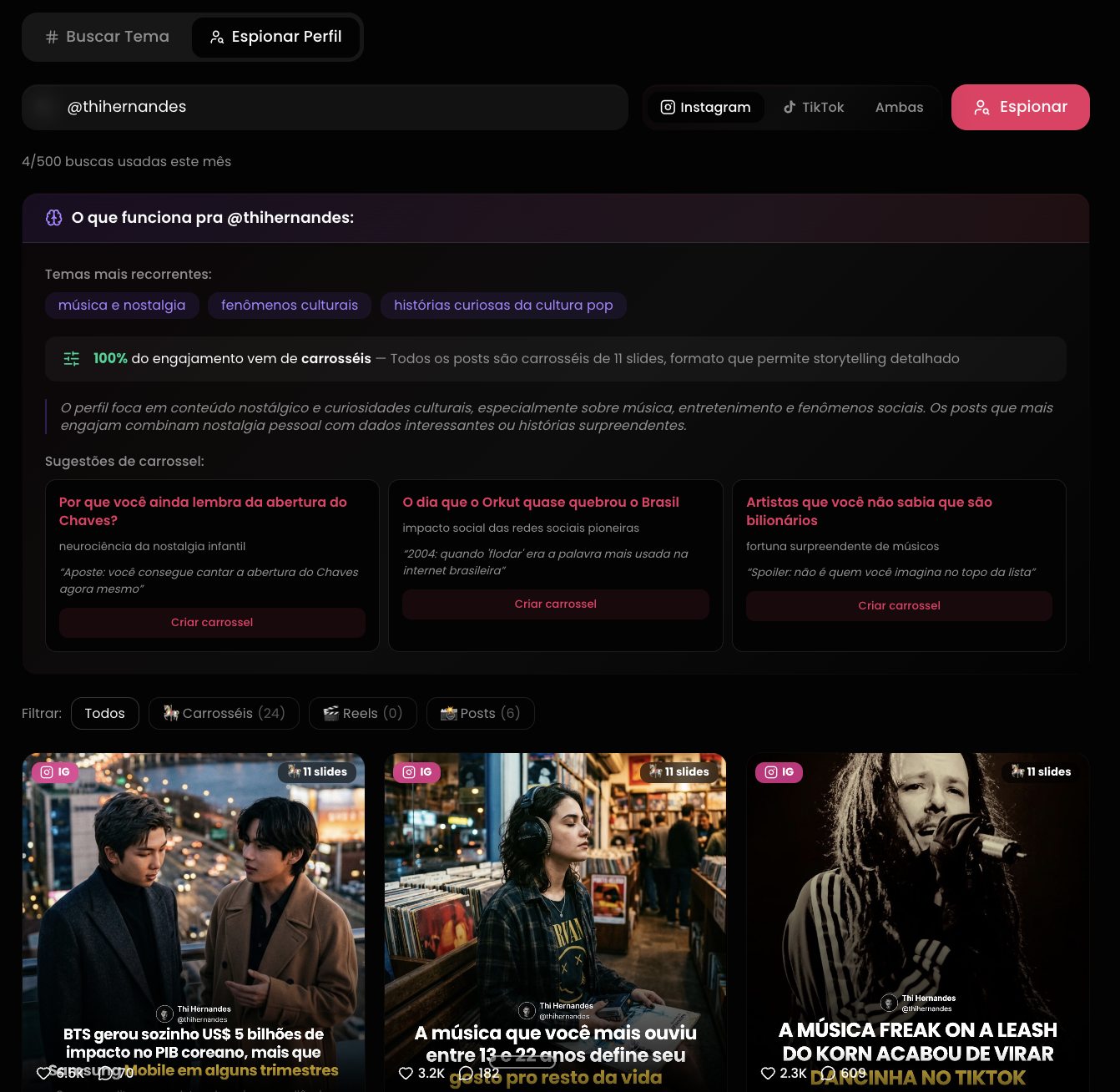 Motor de busca de conteúdo viral no Instagram e TikTok. Pesquise qualquer tema e veja os posts com mais engajamento. Ou espione o perfil de um concorrente — veja exatamente o que funciona pra ele, quais formatos bombam e transforme em carrossel com um clique.