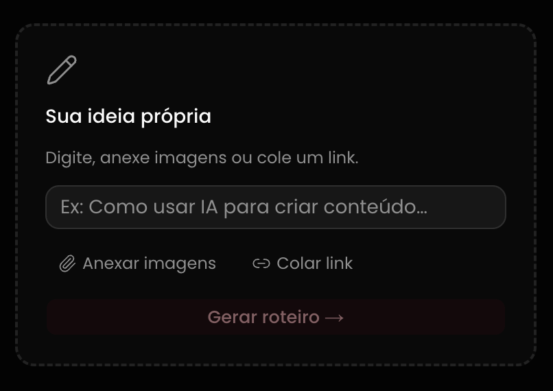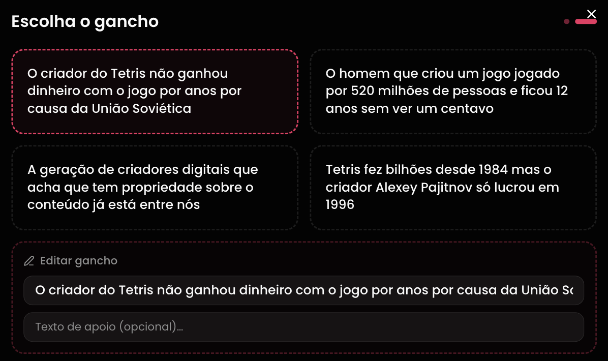 Digita o tema ou usa uma pauta pronta. A IA gera 4 opções de gancho — original, provocativa, autoridade ou storytelling. Cada um com um gatilho mental diferente. Você escolhe qual combate quer comprar.