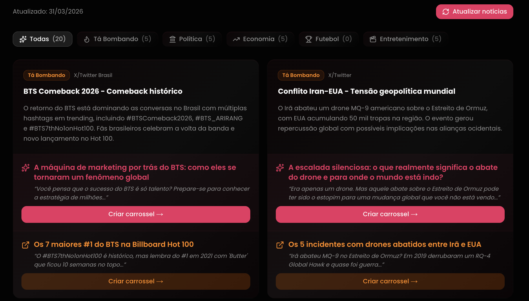 Toda semana a IA analisa o que tá acontecendo no seu nicho e entrega pautas prontas pra virar carrossel. Cada pauta vem com dois ângulos: um narrativo e um com dados reais. É só escolher e criar.